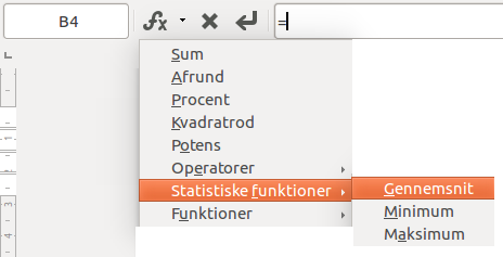 Klikker du på ikonet Formel [fx], får du vist en undermenu, hvor du kan finde en lang række forskellige beregninger, som du kan bruge. Det kan være nyttigt, hvis du skriver tilbud eller andre dokumenter, som primært er tekstbaserede, men hvor du har brug for at foretage beregninger.